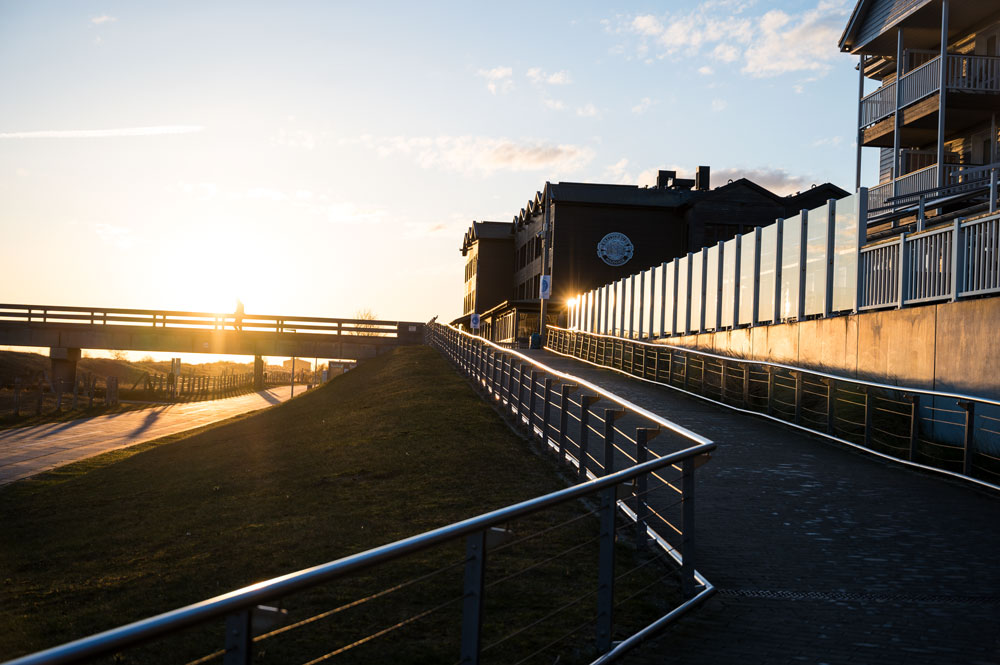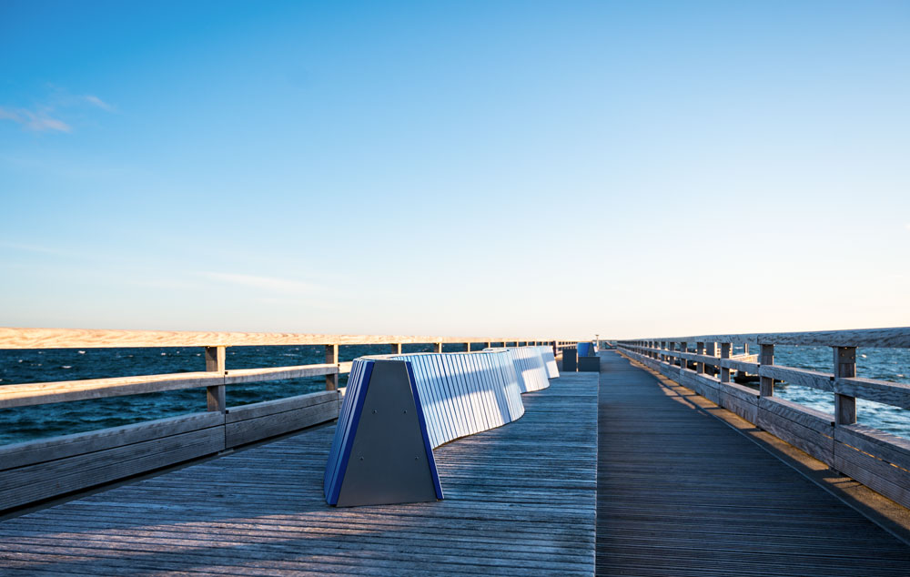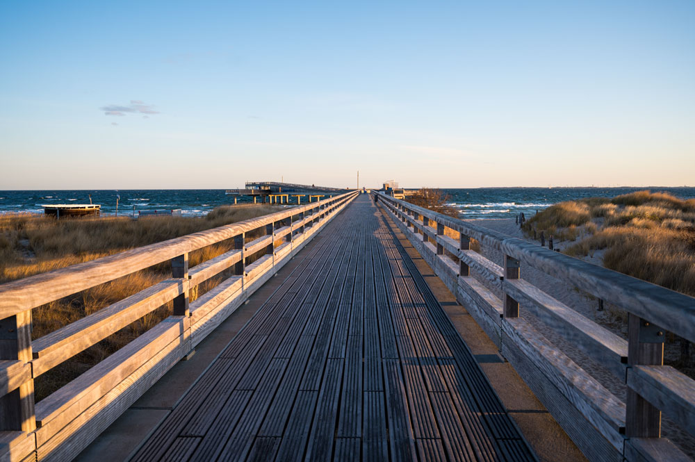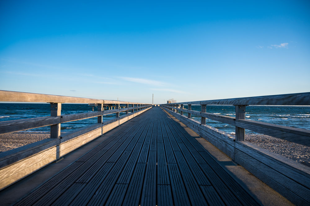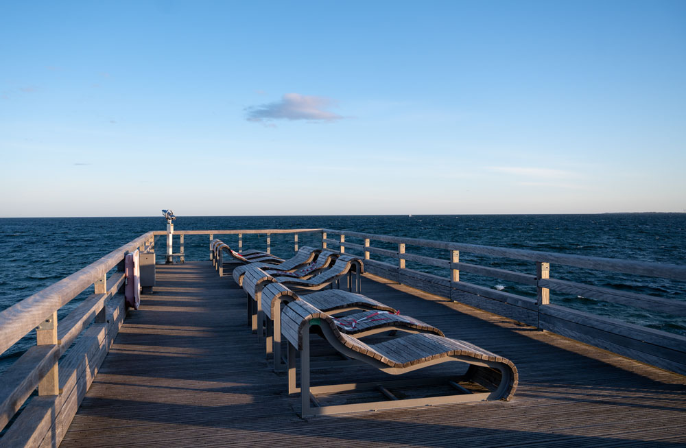 Die Seebrücke wird in diesem Moment zu einem Ort des Ankommens. Man bleibt stehen, blickt hinaus, beginnt den Tag, ohne Eile. Manche gehen langsam bis ans Ende, andere lehnen sich an das Geländer, beobachten das Spiel von Licht und Wellen oder hören einfach dem Wind zu.